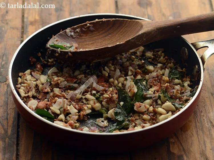 - प्याज और मूंगफली डालें और मध्यम आंच पर 2 से 3 मिनट के लिए भूनें।