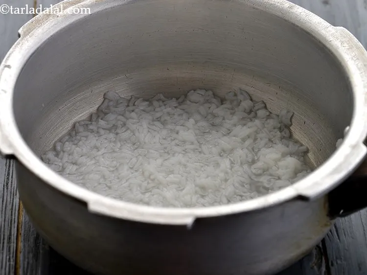 Cover the pressure cooker with the lid and pressure cook for 3 to 4 whistles. The no. of whistles may vary depending on the size and brand of pressure cooker. You need to ensure that the rice is slightly over-cooked and mushy.