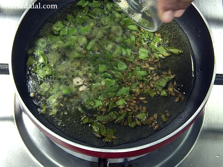 - तड़के के लिए, एक छोटे नॉन-स्टिक पैन में घी गरम करें, उसमें जीरा, कडीपत्ते, हरी मिर्च, हींग, प्याज, काजू और नारियल डालें और मध्यम आँच पर 5 मिनट के लिए बीच-बीच में हिलाते हुए पका लें।