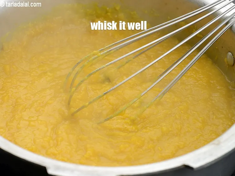 - Add the cooked whisked dal, mixed vegetables, salt and ½ cup of water, mix well and cook on a medium flame for 3 to 4 minutes, while stirring occasionally.