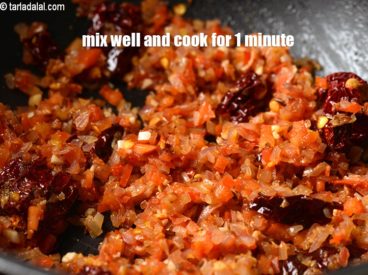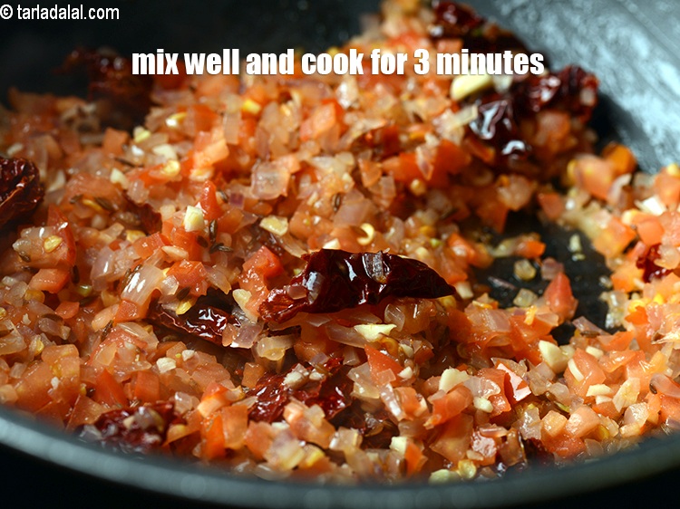 - Add the tomatoes, mix well and cook on a medium flame for 3 minutes, while stirring occasionally.