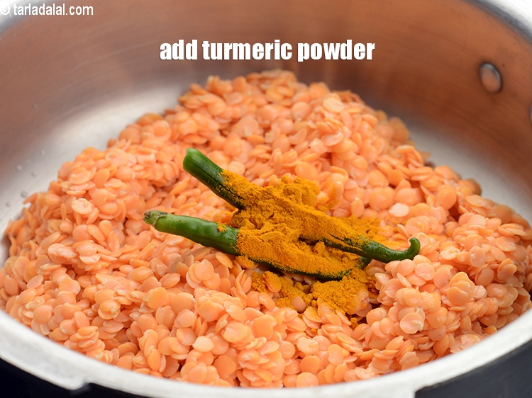 - In a pressure cooker, combine the soaked masoor dal, slit green chilies, turmeric powder, salt and 2 cups of water, mix well and pressure cook for 3 whistles.
