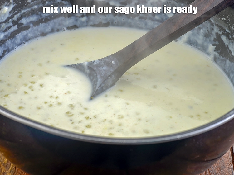 8. भिगोया हुआ साबुदाना डालें। अच्छी तरह से मिलाएं और मध्यम आंच पर बीच बीच में हिलाते हुए १२ मिनट तक  पकाएं। यह जांचने के लिए कि क्या खीर तैयार है, साबुदाना के कुछ मोती निकाल लें और अपने चम्मच के पीछे या केवल अपने अंगूठे और तर्जनी के बीच दबाएं। यह सख्त नहीं होना चाहिए अन्यथा इसे चबाना मुश्किल होगा। यह सकेत देता है कि हमारा साबुदाना पक कर तैयार है।