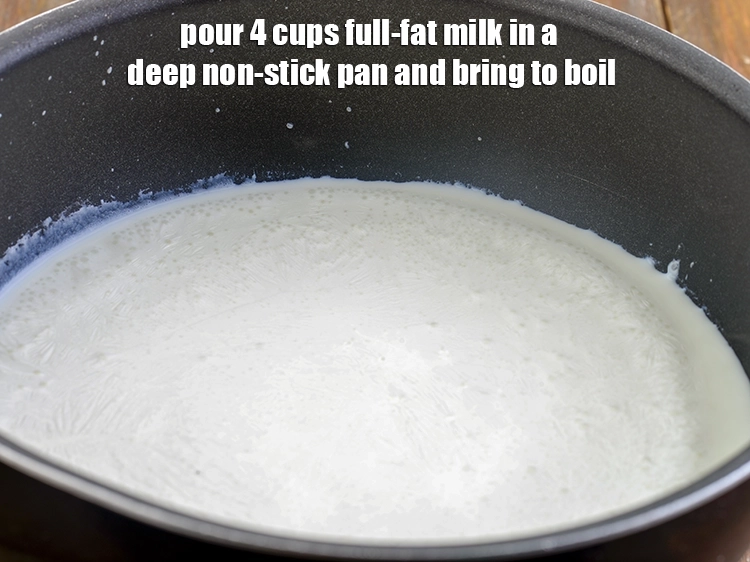 2. एक गहरे नॉन-स्टिक पैन में दूध गर्म करें और मध्यम आंच पर 4 से 5 मिनट तक उबालें।