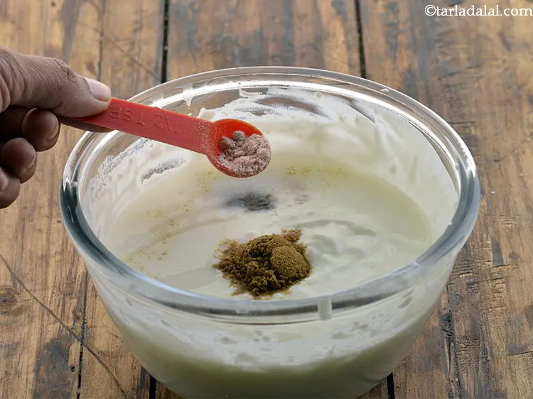 Notes on salted lassi recipe. 1. Take thick curd in a deep bowl. If the curd is not thick, the Salted lassi (Namkeen lassi) will be very watery. Use chilled curd for a cold lassi or if you are using room temperature curd then refrigerate till serving. 2. Then add cumin seeds powder to this. This powder is made by first roasting cumin seeds till fragrant and then grounded into a powder. Roasted cumin seeds powder has a much better, earthy taste.