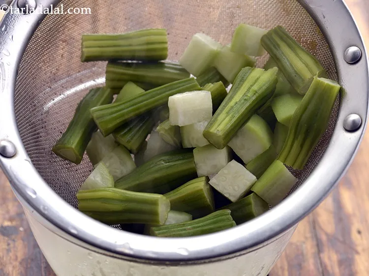 Further add 2 drumsticks (saijan ki phalli / saragavo) , cut into 3'' pieces.