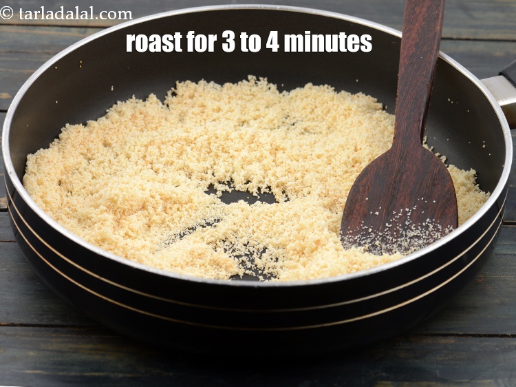 Roast on a medium flame for 3 to 4 minutes or till the semolina is light pink in colour, while stirring continuously.