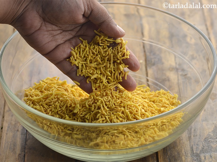 - Transfer the masala sev into a deep bowl and break into pieces using your fingers.