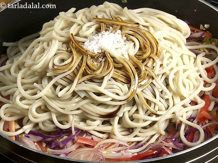- Add the noodles, soy sauce, sugar, honey and salt, toss well on a high flame for 2 minutes, while stirring it continuously.