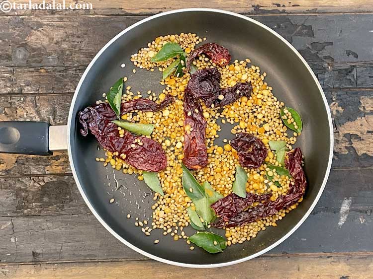 You have to saute till the dals turn light brown in colour. There is a nice aroma of the red chillies, curry leaves that you will experience as the dals turn brown.