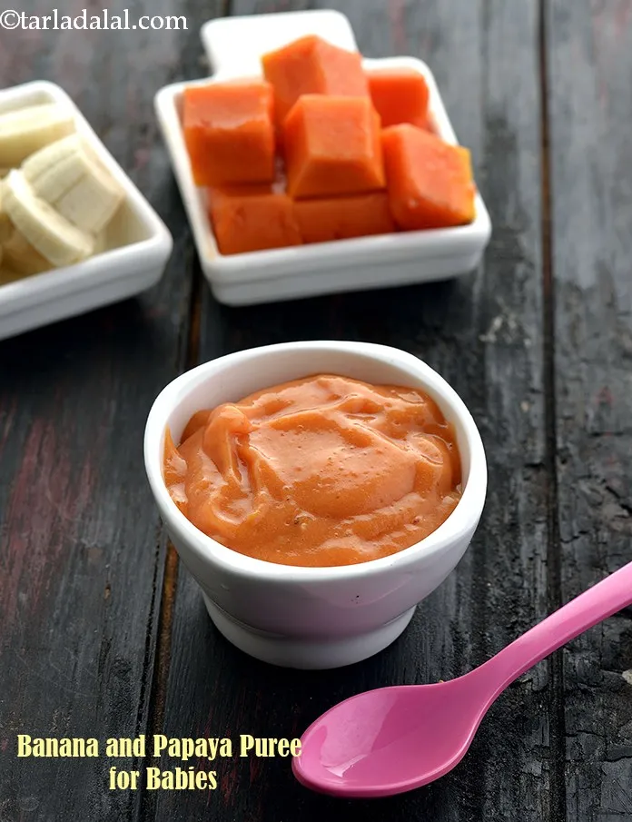 1/4 cup roughly chopped papaya- To make banana and papaya puree, combine the banana and papaya in a mixer and blend till smooth.