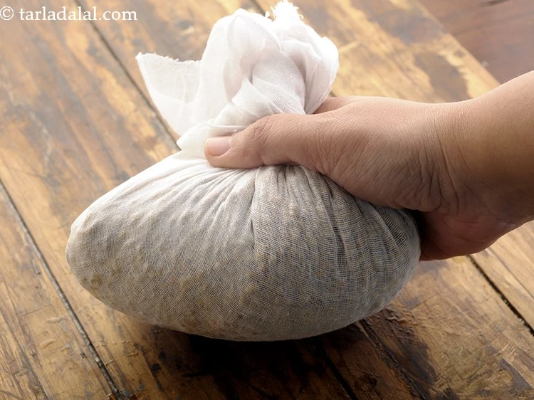- સંપૂર્ણપણે પાણી કાઢી લો અને મલમલના કપડા પર મૂકો.મલમલ કાપડની બધી બાજુઓ ભેગી કરો, તેને વાળો અને તેને એક ઊંડા બાઉલમાં ઊંધું મૂકો.
