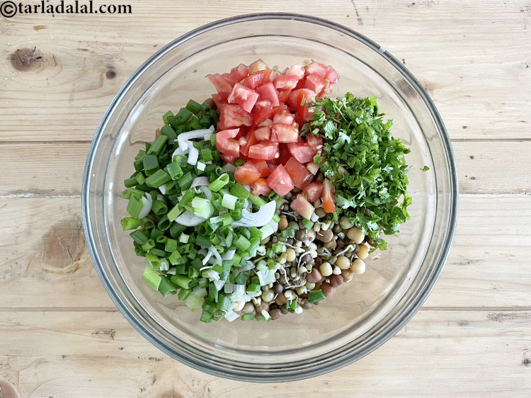 - To make sprouts, spring onion and tomato salad, combine all the ingredients, except the dressing, in a deep bowl and toss well.