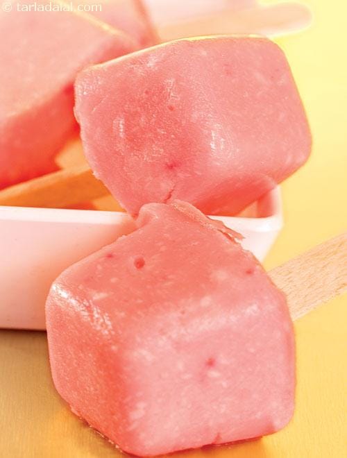 I have used oats to increase the health quotient, which is further enhanced by the goodness of strawberries. Skimmed milk powder and oats give body to the lollies, while strawberries provide the visual appeal.