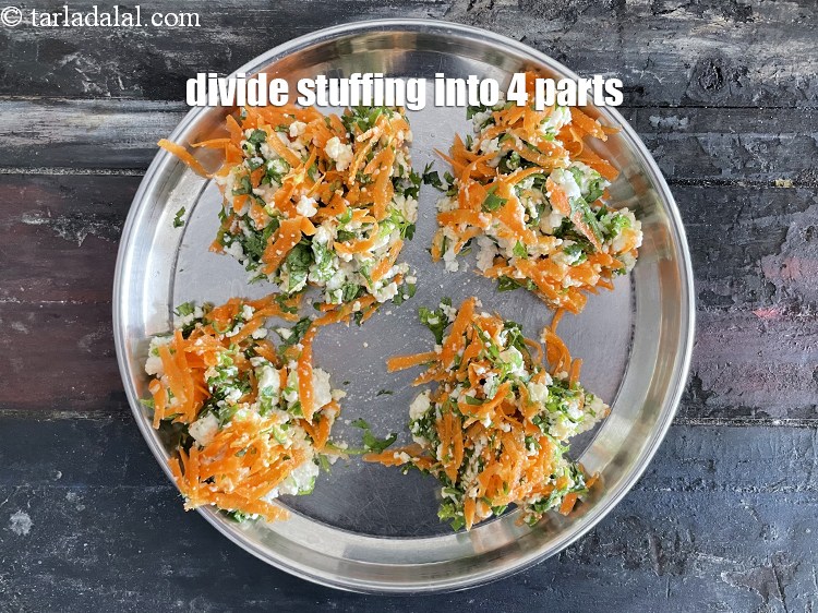 - To make stuffed nachni paratha, divide the stuffing into 4 equal portions and keep aside.