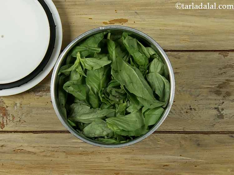 To make the pesto mixture for pesto cream cheese dip | sun dried pesto and cream cheese dip | Indian style pesto cream cheese cold dip | in a mixer jar, take 2 cups of fresh basil leaves. The leaves should not be black or else the dip will have a really dark colour.