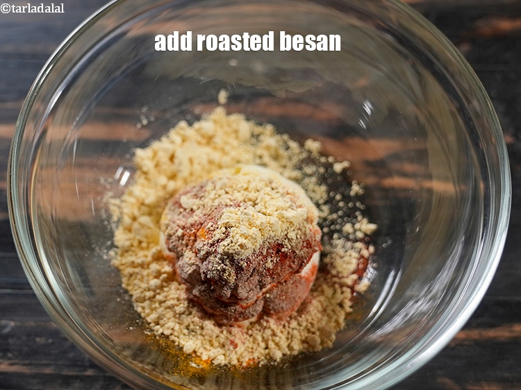 - To make tandoori mushroom, in a deep bowl add hund curd, ginger garlic paste, turmeric powder, chilli powder, dhana jeera powder, chaat masala, roasted besan, garam masala, kasuri methi, salt to taste and lemon juice.