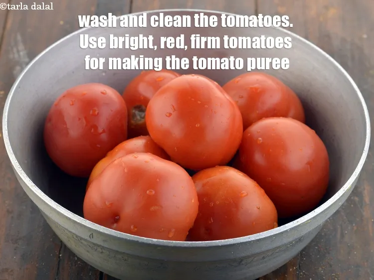Meanwhile, wash and clean the tomatoes. Use bright, red, firm tomatoes for making the tomato puree.