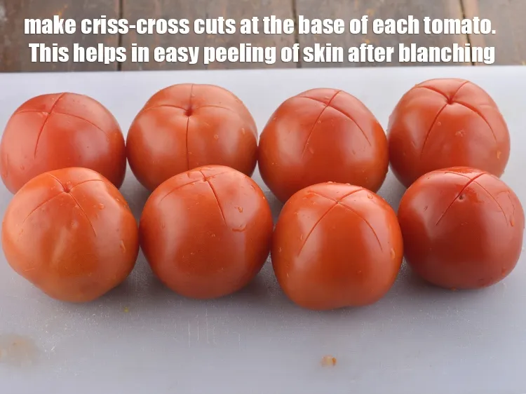 Make criss-cross cuts at the base of each tomato. This helps in easy peeling of skin after blanching.
