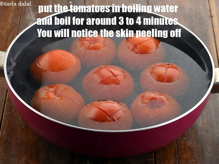 Put the tomatoes in boiling water and boil for around 3 to 4 minutes. You will notice the skin peeling off.