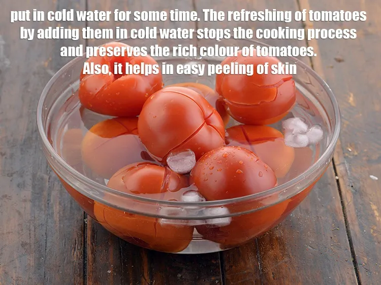 Put in cold water for some time. The refreshing of tomatoes by adding them in cold water stops the cooking process and preserves the rich colour of tomatoes. Also, it helps in easy peeling of skin.