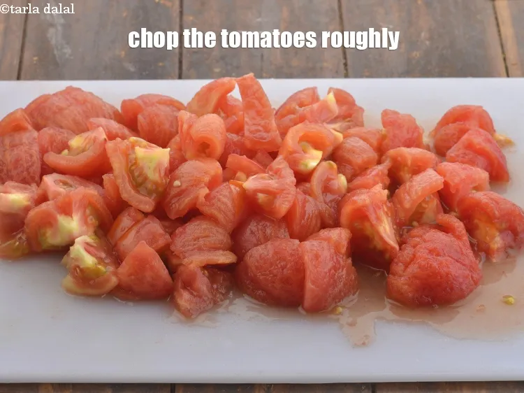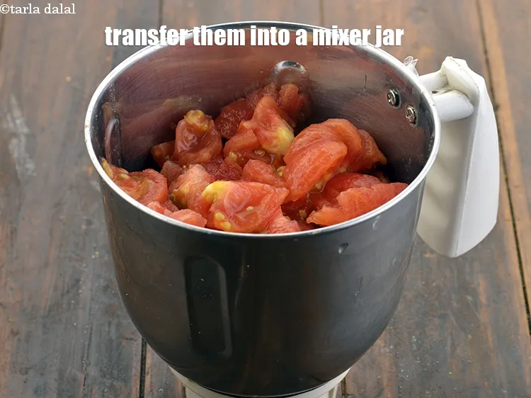 When the tomatoes are cool, peel and discard the skin. Start peeling from the cut portion so, it comes out easily.