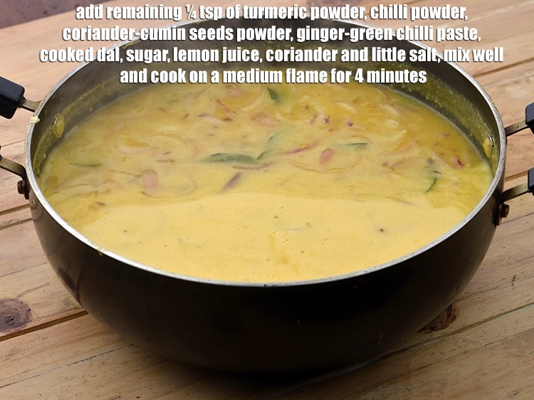 - Add the remaining ¼ tsp of turmeric powder, chilli powder, coriander-cumin seeds powder, ginger-green chilli paste, cooked dal, sugar, lemon juice, coriander and little salt, mix well and cook on a medium flame for 4 minutes, while stirring occasionally.