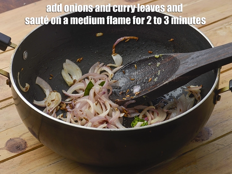 - When the seeds crackle, add the onions and curry leaves and sauté on a medium flame for 2 to 3 minutes.
