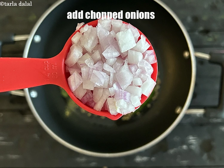 - जब राई चटकने लगे तो इसमें हींग और प्याज डालें और प्याज के सुनहरा होने तक भून लें।
