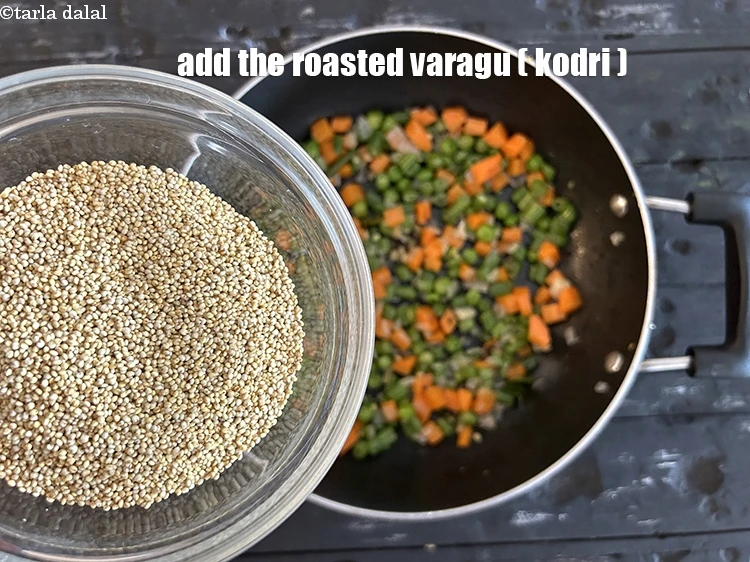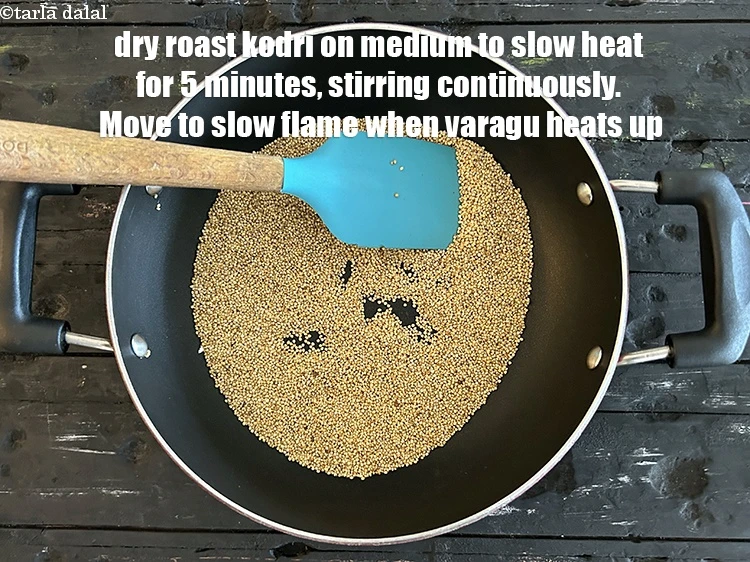 कोदरी को मध्यम से धीमी आंच पर लगातार हिलाते हुए 5 मिनट तक सूखा भून लें। जब वरागू गर्म हो जाए तो आंच धीमी कर दें।