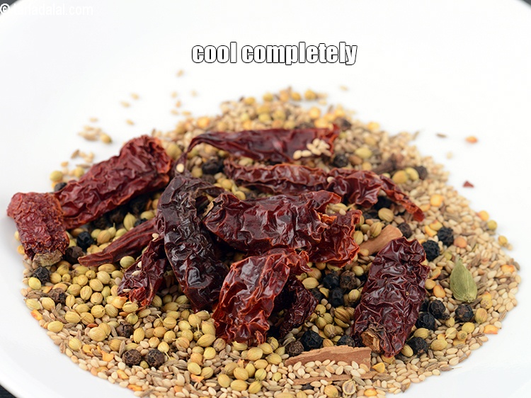 - To make vegetable bhuna masala recipe, heat a small non-stick pan add the red chilles, coriander seeds, peppercorns, cardamom, cinnamon, clove, cumin seeds and sesame seeds and roast on a medium flame for 3 minutes.
