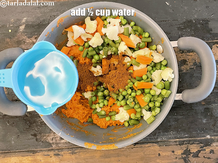 - Add the vegetables, salt, garam masala and ½ cup of water, mix gently and cook on a medium flame for 2 minutes, while stirirng occasionally.