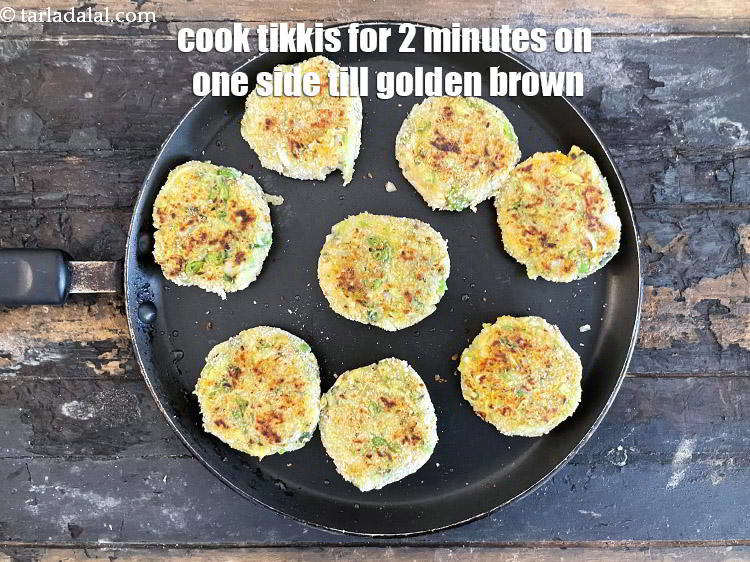 Cook 7 tikkis at a time using a little oil on a medium flame for 2 minutes or till they turn golden brown in colour on one side.