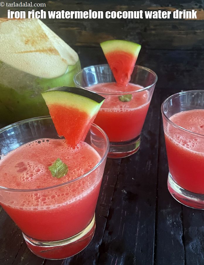 Watermelon is a cooling fruit, which is made even better by the addition of coconut water in this heart-friendly and lower blood pressure drink, which is effective in balancing the stomach acids.
