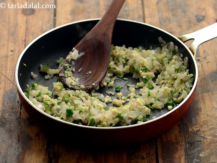 - Heat the oil in a small non-stick pan, add the onions, garlic and green chillies and sauté on a medium flame for 1 minute.
